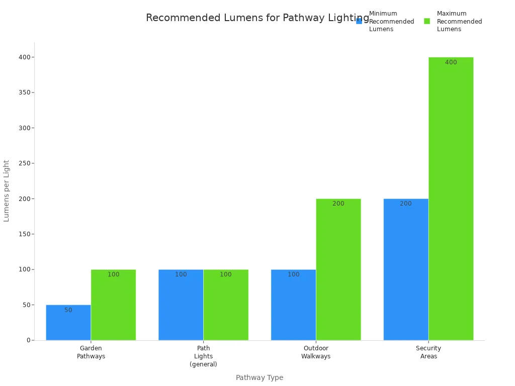 Ważne jest, aby mieć bezpieczne ścieżki na zewnątrz. Oświetlenie ścieżek pomaga ludziom zobaczyć, gdzie iść. Zapobiega także potknięciom i upadkom. Do ścieżek ogrodowych używaj lamp o mocy 50–100 lumenów. Aby zapewnić dobre oświetlenie, chodniki potrzebują 100–200 lumenów. Jeśli chcesz większego bezpieczeństwa, użyj 200–400 lumenów na światło. Aby uzyskać równomierne światło, umieść zewnętrzne lampy LED w odległości 6–8 stóp od siebie. Wąskie ścieżki wymagają oświetlenia umieszczonego bliżej siebie. Szerokie ścieżki mogą mieć światła bardziej od siebie oddalone. Umieść światła około 14 cali nad ziemią. Daje to bezpośrednią wiązkę światła i sprawia, że ścieżka wygląda ładnie.
