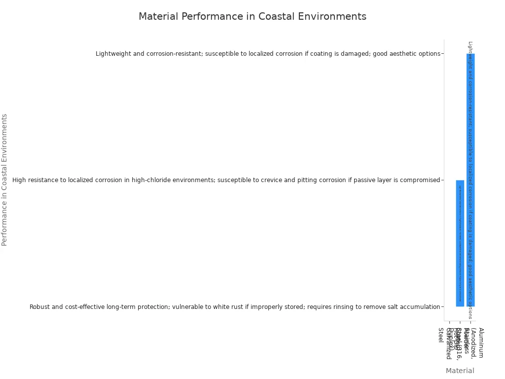 Producenci stosują powłoki proszkowe i uszczelnione osłony, aby zapewnić dłuższą żywotność świateł. Dzięki tym funkcjom oświetlenie LED odporne na warunki atmosferyczne przetrwa burze, wilgotne powietrze i mgłę solną. Na poniższym wykresie możesz zobaczyć, jak różne materiały zachowują się w pobliżu morza: